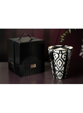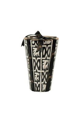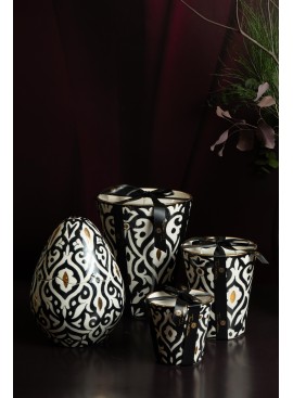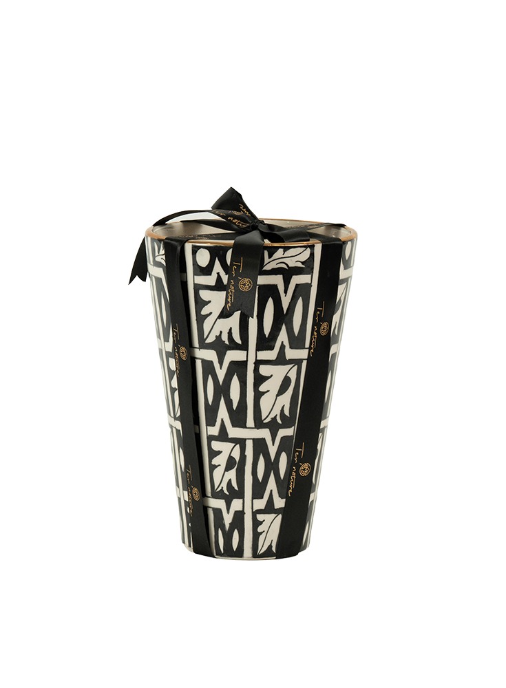 Élégante et intemporelle, la bougie Jardin de Fès se dévoile dans une poterie artisanale noir et blanc, façonnée avec soin et sublimée par un délicat liseré en or.