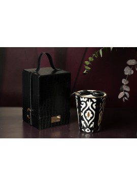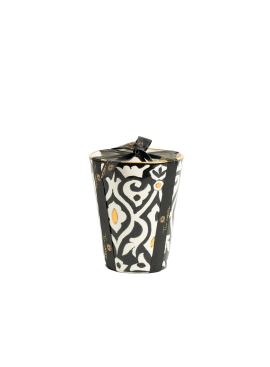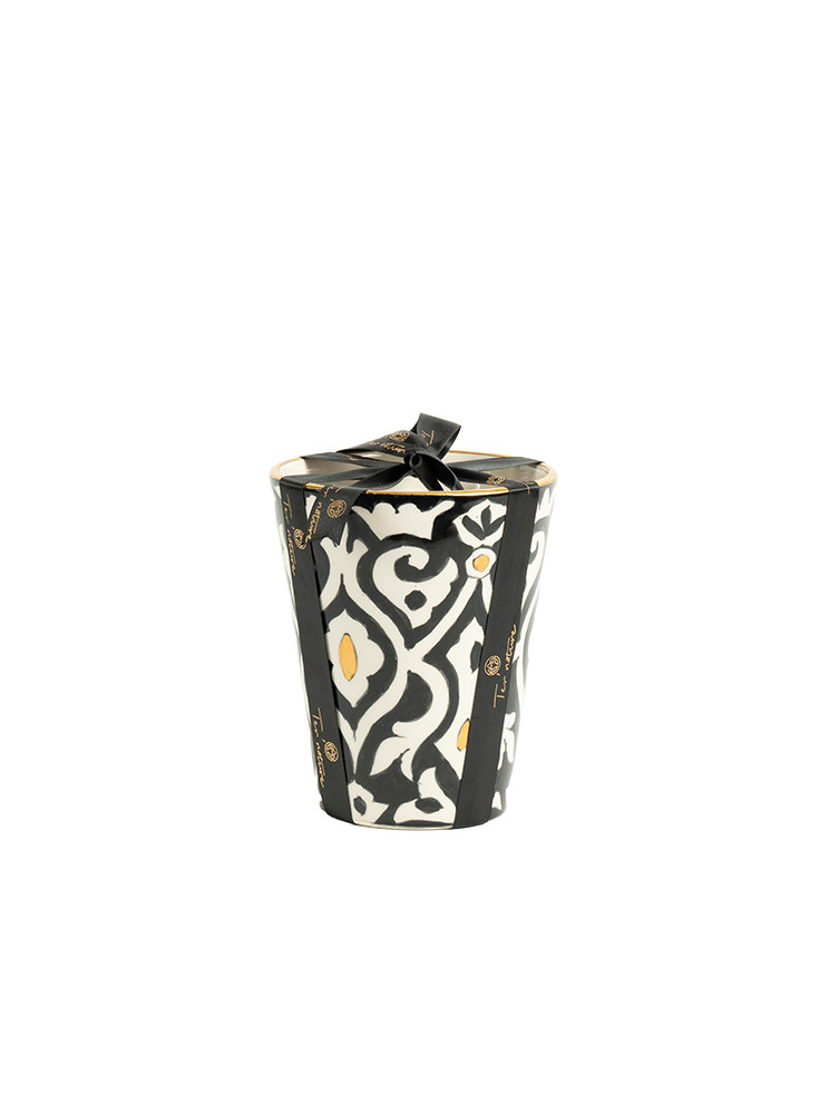 Raffinée et intemporelle, la bougie Jardin de Fès se dévoile dans une poterie artisanale noir et blanc, façonnée avec soin et sublimée par un délicat liseré en or.