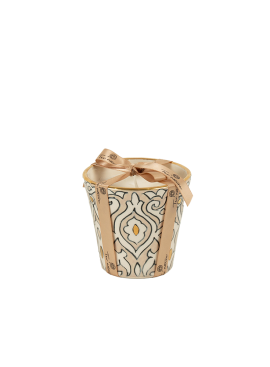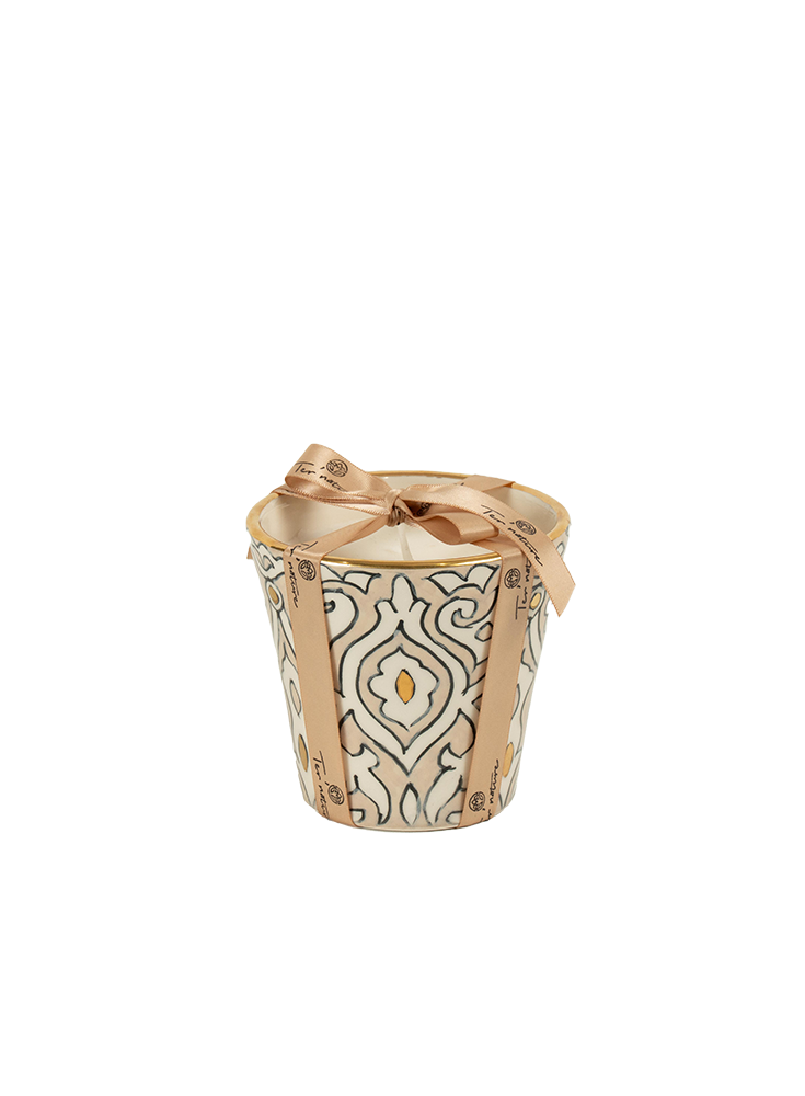 Élégante et délicate, la bougie Jardin de Fès s’habille d’une poterie artisanale beige, sublimée d’un fin liseré doré.