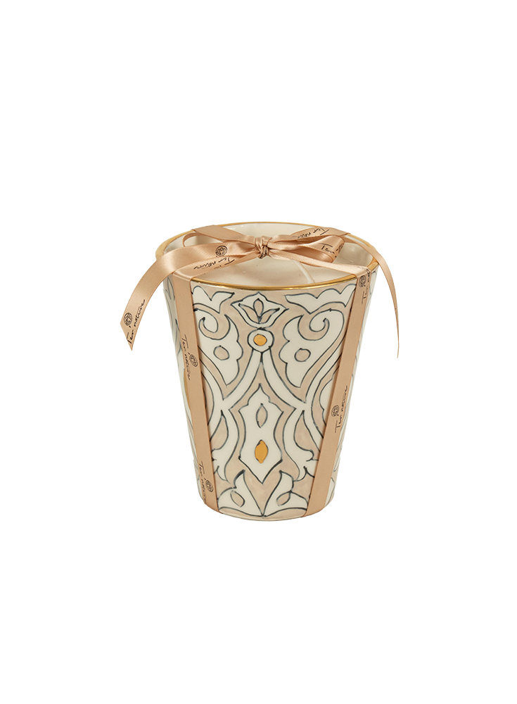 Raffinée et intemporelle, la bougie Jardin de Fès se dévoile dans une poterie artisanale beige, rehaussée d’un délicat liseré doré.