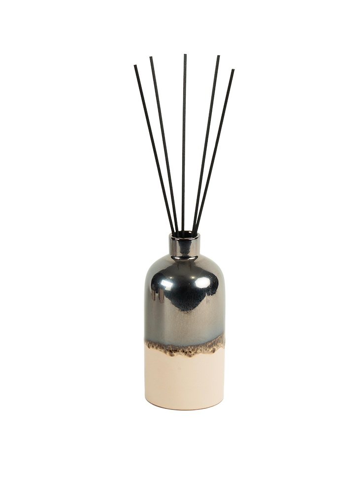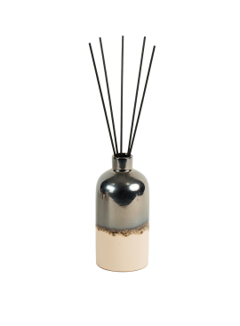Raffiné et contemporain, le difuseur Perle de Sable se présente dans une poterie artisanale bicolore : beige lumineux et argenté foncé, un contraste élégant qui évoque la rencontre entre la douceur des dunes et l’éclat minéral.