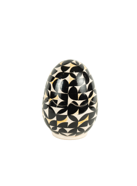 Élégante et audacieuse, la bougie de la collection Mystère des Dunes se présente dans une poterie artisanale ornée de motifs géométriques noirs et beiges aux reflets dorés.