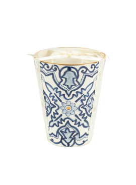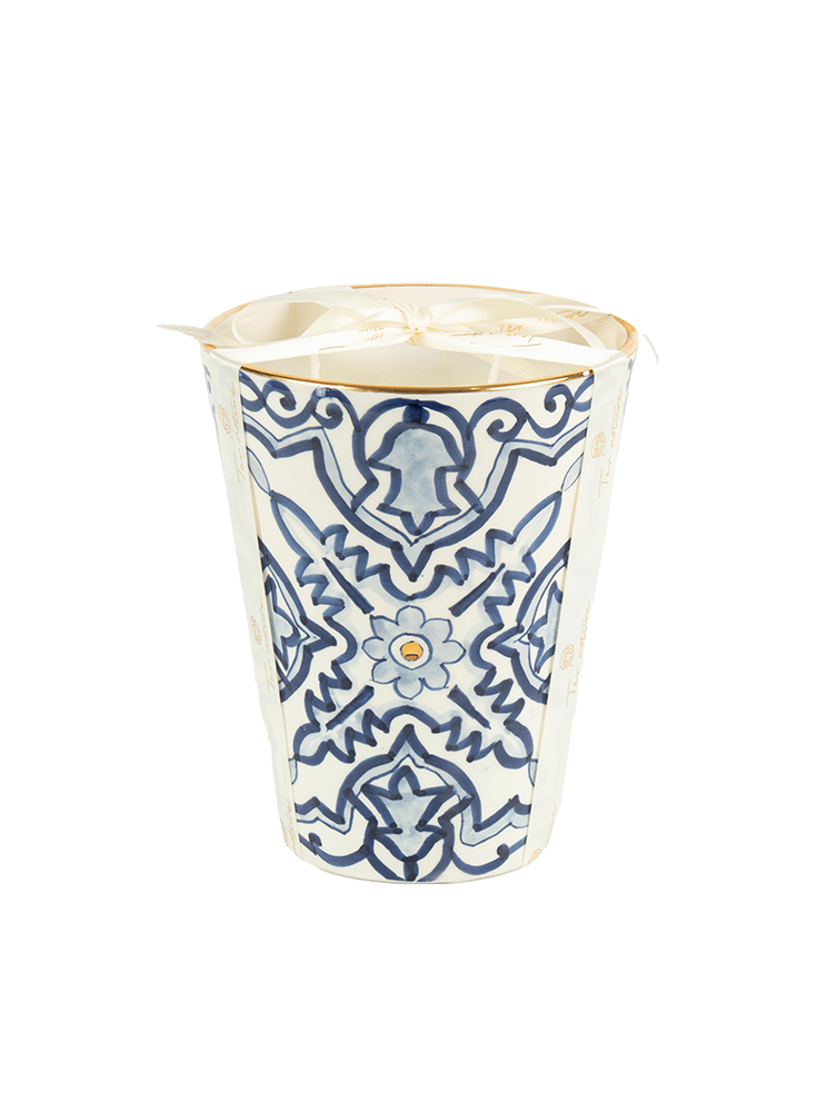 Chic et luxueuse, la bougie Saphir se dévoile dans une poterie artisanale aux motifs bleu et blanc, sublimés par de véritables touches d’or.