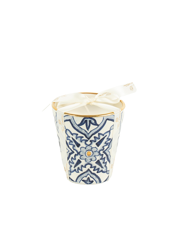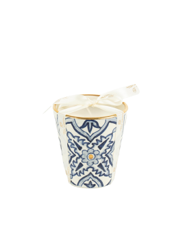 Chic et luxueuse, la bougie Saphir se dévoile dans une poterie artisanale aux motifs bleu et blanc, sublimés par de véritables touches d’or.