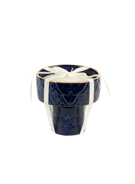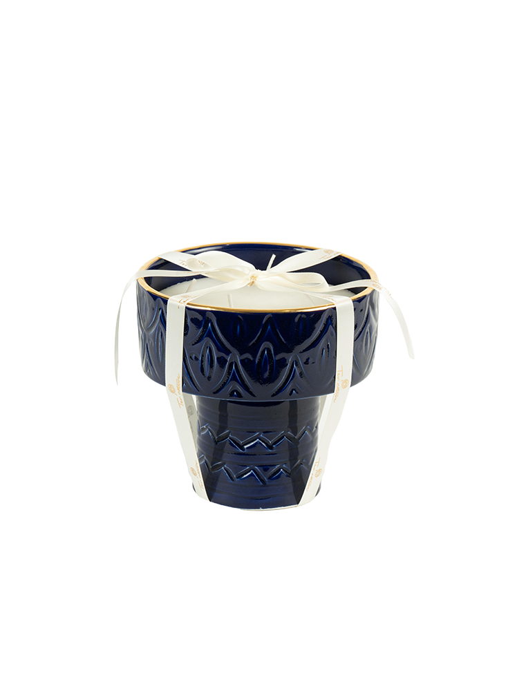 Élégante et raffinée, la bougie Empreinte Bleue se présente dans une poterie artisanale gravée, sublimée par de délicates finitions en or véritable.