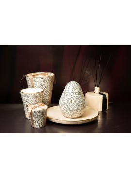 Raffiné et lumineux, le diffuseur en poterie beige, sublimé d’un délicat liseré en or, allie sobriété et élégance.