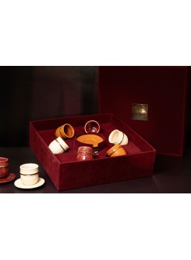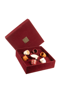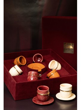 Un écrin en velours renfermant six tasses en poterie délicatement soulignées d´un liseré en Or.