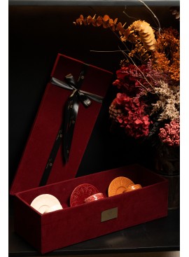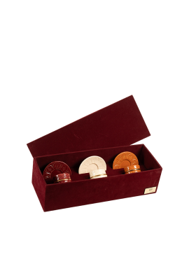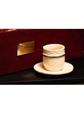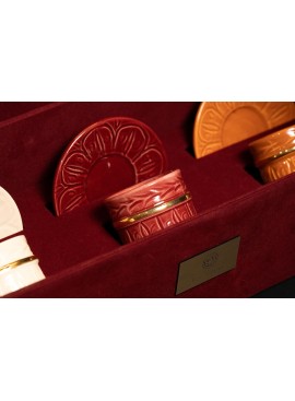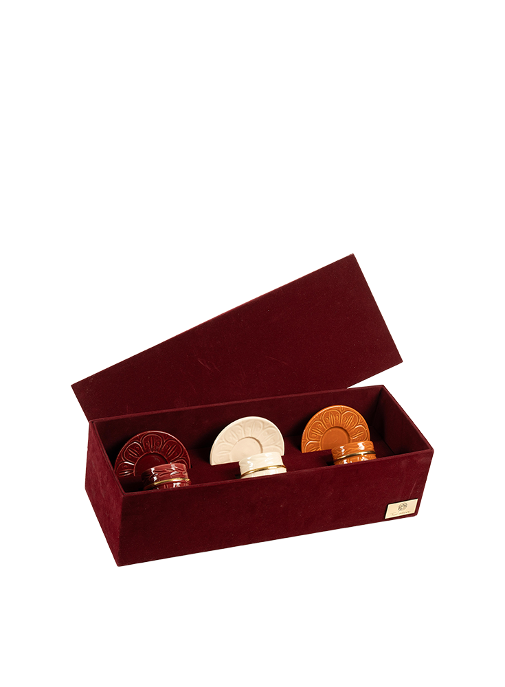 Un écrin en velours renfermant 3 tasses en poterie délicatement soulignées d´un liseré en Or.