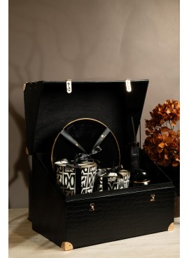 d’ambiance et un plateau en céramique, présentés dans un écrin texturé en simili cuir.