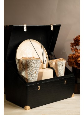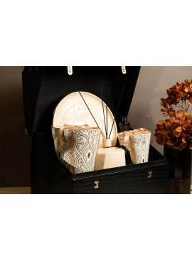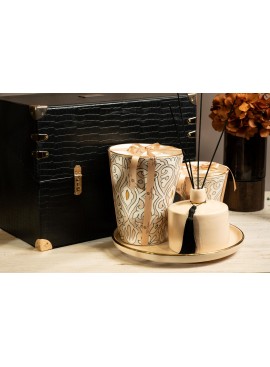 Symbole d’élégance intemporelle, il réunit des bougies raffinées, un diffuseur d’ambiance et un plateau en céramique, présentés dans un écrin texturé en simili cuir.