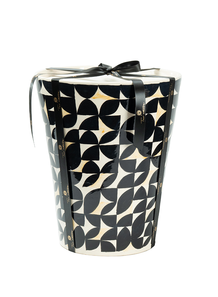 Élégante et audacieuse, la bougie de la collection Mystère des Dunes se présente dans une poterie artisanale ornée de motifs géométriques noirs et beiges aux reflets dorés.