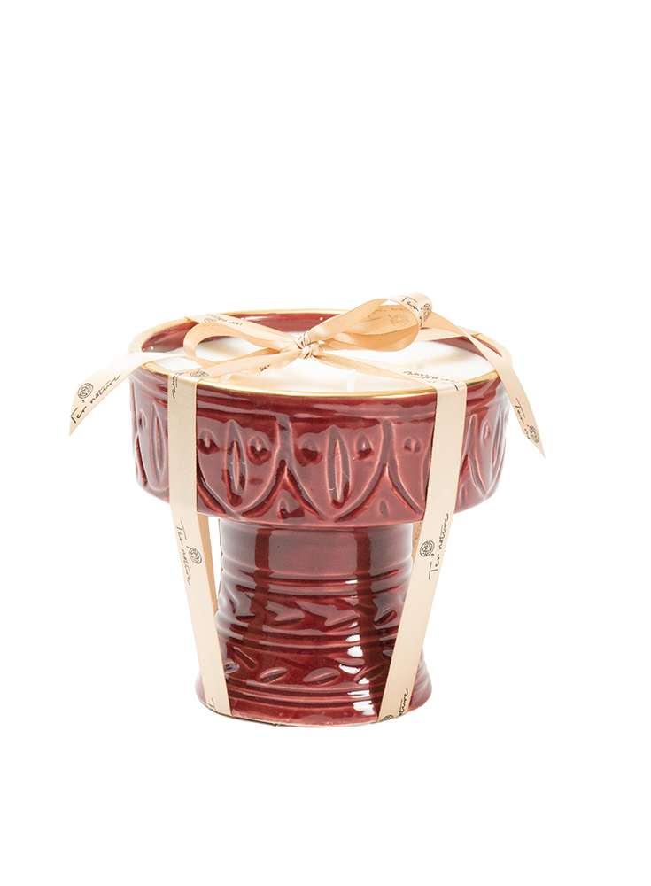 Chic et envoûtante, la bougie Empreinte Bordeaux se présente dans une poterie artisanale d’un rouge profond, sublimée de délicats reflets dorés.